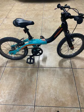 Bicicleta infantil de la marca Orbea, ideal para los más pequeños. - Color principal verde azulado con detalles naranjas. - Ruedas de 16 pulgadas. - Incluye ruedines.