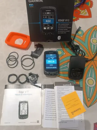Ciclocomputador Garmin Edge 810 con accesorios. - Incluye soporte para manillar. - Funda de silicona naranja. - Anillos de goma de sujeción. - Cargador y cable. - Manual de inicio rápido.
