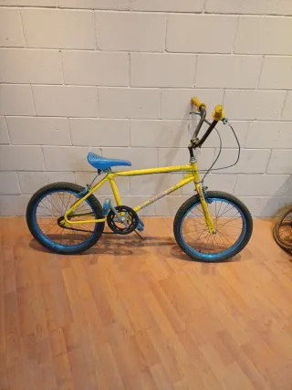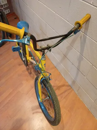 Bicicleta BMX de estilo clásico, color amarillo con detalles en azul. - Cuadro de metal. - Ruedas de 20 pulgadas. - Asiento azul. - Puños amarillos.