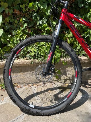 Bicicleta de montaña en color rojo, ideal para disfrutar de rutas y caminos. - Cuadro de aluminio. - Ruedas de 29 pulgadas. - Frenos de disco. - Suspensión delantera. Talla L Valió 479 euros Apenas tiene 2 años y solo utilizada 2/3 veces.