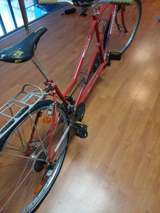 Bicicleta tándem de la marca Bianchi, color rojo. - Cuadro de bicicleta tándem. - Ruedas de bicicleta. - Manillar de bicicleta.