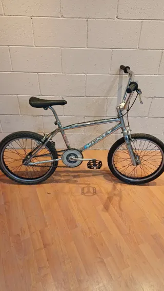 Bicicleta BMX Monty modelo 112, con un diseño clásico y resistente. - Cuadro plateado brillante. - Ruedas de 20 pulgadas. - Manillar cromado.