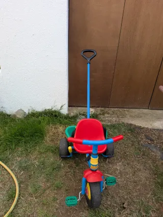 Triciclo infantil rojo y verde con empujador