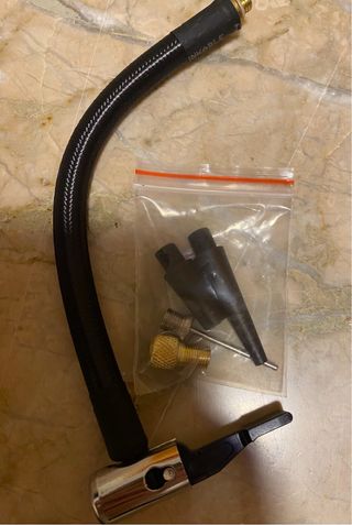 Inflador de pie para bicicletas o balones, con manómetro integrado para controlar la presión. - Diseño vertical. - Manguera flexible. - Cabezal adaptable.