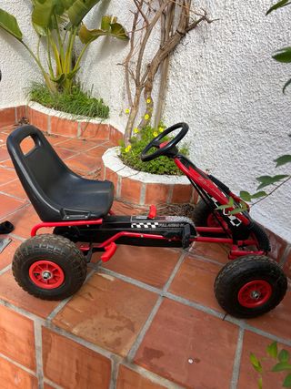 Divertido coche a pedales para niños, ideal para horas de juego al aire libre. - Estructura de metal resistente. - Asiento ergonómico. - Ruedas todoterreno. - Diseño deportivo en rojo y negro.