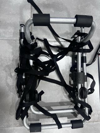 Portabicicletas para maletero con correas de sujeción. - Estructura metálica. - Correas negras ajustables. - Incluye señal reflectante roja y blanca.