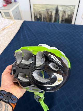 Casco de ciclismo de la marca Catlike con un diseño moderno y aerodinámico. - Color blanco, verde y negro. - Diseño con múltiples ventilaciones. - Logo de la marca visible.