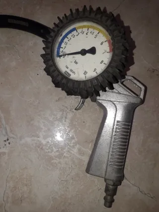 Pistola infladora de neumáticos con manómetro WIKA. - Manómetro con escala en bares y kPa. - Indicador de presión con zonas de color (azul, blanco, amarillo, rojo). - Cuerpo de metal resistente.