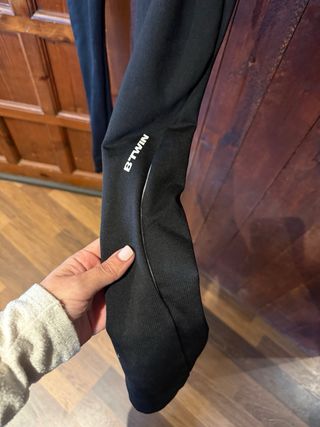 Mallas largas de ciclismo en color negro. Diseñadas para ofrecer comodidad en tus rutas. - Tejido elástico. - Banda en la cintura. - Ribete reflectante en los laterales. Pequeño agujero que se puede coser. De ahí el precio. Por lo demás, está perfecto.