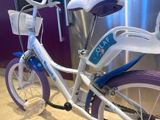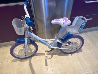 Bicicleta infantil con temática de Frozen II, ideal para los más pequeños. Cuenta con un diseño divertido y colorido. - Color principal blanco con detalles en morado y azul. - Incluye cesta delantera. - Asiento trasero para muñeca o figura. - en muy buen estado.