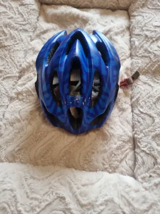 Casco de bicicleta con un diseño llamativo en azul. - Diseño con patrones geométricos. - Hebilla de ajuste roja. Precio negociable