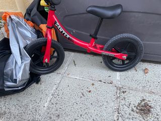 Bicicleta de equilibrio de la marca Sawyer, ideal para que los más pequeños aprendan a montar. - Marco de color rojo. - Ruedas negras. - Asiento negro ajustable.