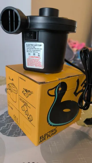 Inflador eléctrico Jisdon modelo CZ-1988, ideal para inflar colchones y otros artículos. - Voltaje: AC220V-240V 50Hz. - Potencia: 50W. - Presión máxima: 0.7psi (5000pa). - Caudal máximo: 400L/min. - Incluye varios adaptadores para diferentes válvulas. - Fabricado en China.