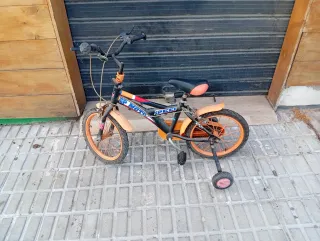 Bicicleta infantil de color azul y rojo, con ruedines para facilitar el aprendizaje. - Manillar con puños rojos. - Ruedas con llantas naranjas. - Pedales negros. Para interesados llamarme a este número 685600574