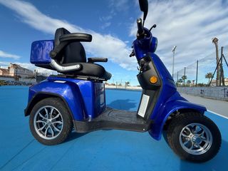 ACEPTO CAMBIO Scooter eléctrico VELECO FASTER de 4 ruedas para movilidad reducida, color azul, prácticamente nuevo (50 km reales). Muy estable y seguro, con ruedas traseras anti-vuelco, marcha atrás, varias velocidades y pantalla digital. Asiento cómodo con respaldo y reposabrazos. Tiene doble maletero con cierre de seguridad y alarma antirrobo. 100 % eléctrico, silencioso y de bajo mantenimiento. Autonomía aprox. 40–60 km. Funciona perfectamente, se entrega con cargador. Venta por no utilizar.