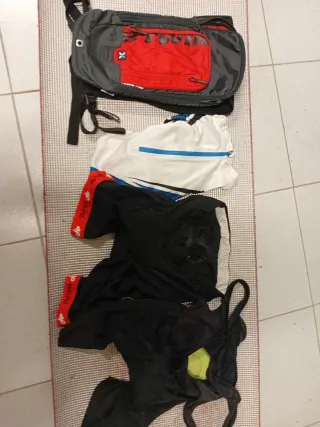 Conjunto de ropa y mochila para ciclismo. - Mochila negra y roja Btwin. todo talla M. pantalones y camiseta con uso pero sin daños ni rasgaduras. mochila bolsa casi sin uso, no es hidrante. es pequeña. decathlon btwin aptonia kalengi lidl carretera carreras btt vintage retro - Culotte negro con detalles rojos. - Maillot blanco, azul y negro. Culotte negre, presentan desgaste en la ropa ,badanas bien. Utilizables para empezar ciclismo