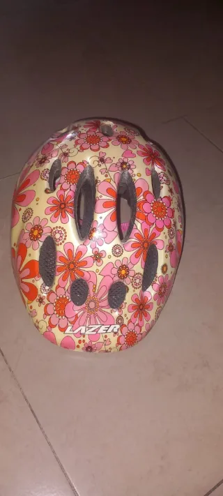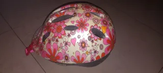 Casco infantil con un divertido diseño de flores en tonos rosas y naranjas. Se encuentra en buenas condiciones. - Diseño floral alegre. - Correa ajustable.
