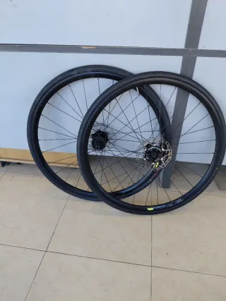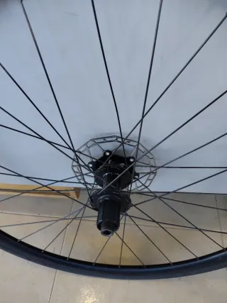 Juego de ruedas para bicicleta de carretera. - Llantas de aluminio - para eje pasante de 12mm - Con disco de 160 incluido - nucleo de 11 velocidades - Neumaticos y camara de 28