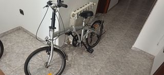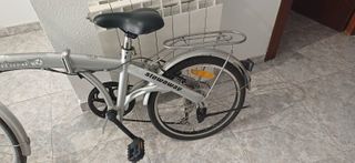 Bicicleta plegable de color plateado. - Cuadro plegable. - Ruedas de 20 pulgadas. - Incluye guardabarros.
