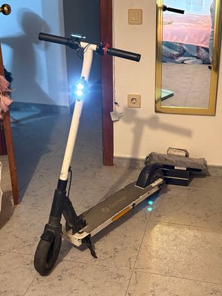 Patinete eléctrico Denver en color blanco. Ideal para desplazamientos urbanos. - Luces LED delanteras y traseras. - Rueda delantera y trasera. - Plataforma con logo Denver. No tiene certificado dgt Se tendrian que arreglar la palanca de el acelerador porque se mueve i la palanca fel freno porque se mueve