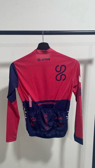 Maillot de ciclismo de manga larga con diseño Atika Mussara. - Color principal: rosa fucsia. - Paneles inferiores en azul marino. - Logos de etixx y ATIKA visibles. - Detalle de MOVISTAR en la manga.