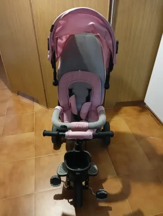 Triciclo Kinderkraft en color rosa, ideal para paseos. - Asiento acolchado. - Barra de seguridad. - Reposapiés. - Capota. - Empuñadura para padres.