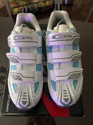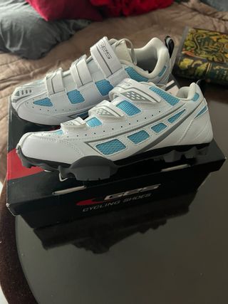 Zapatillas de ciclismo GES para MTB en color blanco y azul. Cuentan con un diseño deportivo y cierre de velcro. Número 39 - Cierre de tres velcros. - Malla transpirable en color azul. - Detalle de logo GES en las tiras.