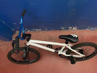 Bicicleta BMX de color blanco con detalles en azul. Cubiertas al 90%. Solo Freno delantero. Esta en buenas condiciones - Manillar azul. - Ruedas negras. - Sillín negro.