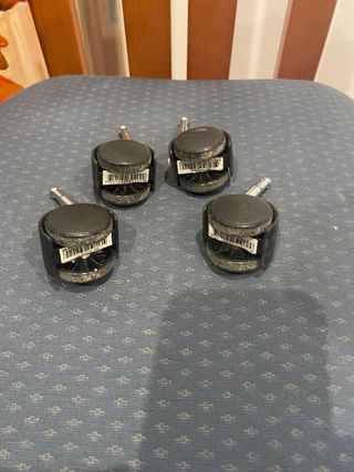 Pack de cuatro ruedas para muebles. Son ideales para facilitar el movimiento de mobiliario. - Ruedas giratorias de plástico negro. - Eje metálico para fijación.