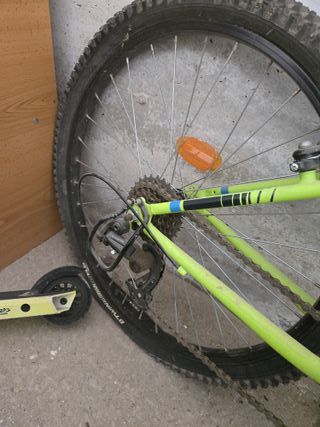Bicicleta infantil Rockrider ST 500 en color verde lima, ideal para iniciarse en el ciclismo. Ha tenido muy poco uso. - Cuadro de aluminio. - Frenos V-brake. - Ruedas de 20 pulgadas.