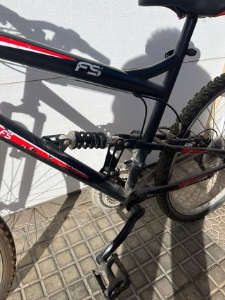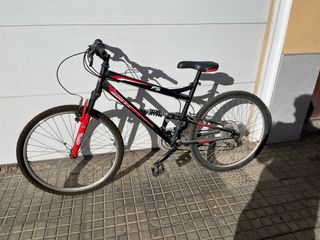 Bicicleta de montaña con ruedas de 26 pulgadas y doble suspensión. Es una bicicleta vieja pero funciona perfectamente