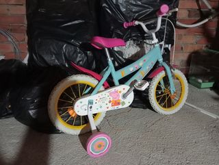 Bicicleta infantil con diseño de Peppa Pig, ideal para los más pequeños. - Color azul y rosa. - Ruedines de apoyo. - Ruedas blancas con llantas amarillas.
