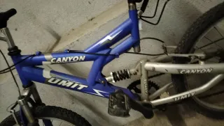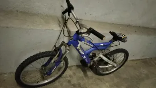 Bicicleta infantil de montaña con suspensión delantera y trasera. - Cuadro azul y plateado. - Ruedas de 20 pulgadas. - Frenos de disco.