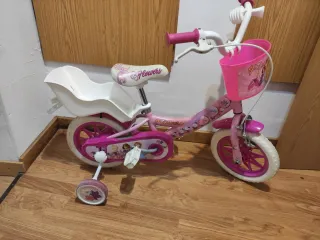 Bicicleta infantil de color rosa, con ruedas de 12 pulgadas y ruedines muy sencillos de poner y quitar. Ideal como primera bicicleta para aprender a ir sin ruedines. Está en buen estado. - Cesta delantera con diseño de princesas. - Sillín blanco y asiento trasero para pasear peluches, muñecos, etc. - Diseño con flores y princesas