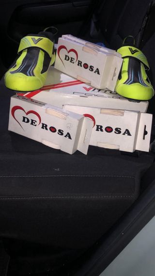 Zapatillas de ciclismo de la marca Vittoria - Color amarillo flúor y negro. - Cierre de velcro. - Suela con diseño deportivo. - De regalo 4 cubremanillares de la marca deRosa!
