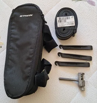 Kit de reparación para bicicleta . Incluye una cámara de aire y herramientas esenciales para reparaciones rápidas. - Cámara de aire Btwin 26x1.7/2.2 Schrader. - Juego de 3 desmontables. - Herramienta para cadena.