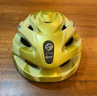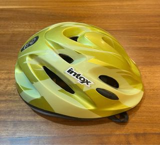 Casco de bicicleta infantil con un diseño llamativo. - Color verde con estampado. - Marca: Intox. Tiene alguna pequeña marca de uso