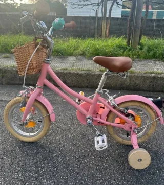 Bicicleta infantil de color rosa, ideal para los más pequeños. Hasta 4 años, algún rasguño. Usada. Sin cesto incluido. 12'' - Ruedines incluidos. - Sillín y puños marrones.