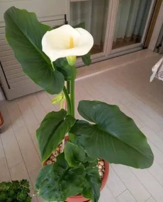 Planta de calas blancas con hojas verdes y exuberantes. Ideal para decorar interiores o exteriores. -se venden hijos pequeños en maceta reciclable. - Floración blanca. - Hojas verdes grandes y brillantes. - para envíos mínimo 15 euros de compra de mi perfil. Crecimiento rápido.