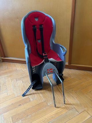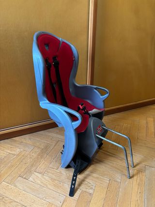 Silla para transportar a un niño en bicicleta. Cuenta con cinturones de seguridad y reposapiés. - Color gris y verde. - Material plástico resistente. - Incluye sistema de anclaje.