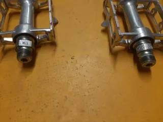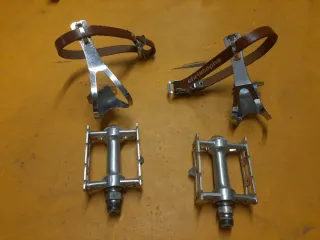Conjunto de pedales clásicos de aluminio con cintas de cuero. - Fabricados en aluminio. - Incluyen cintas de cuero para sujeción. - Diseño vintage para bicicletas clásicas.