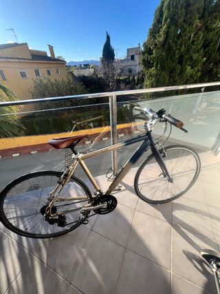 Bicicleta de carretera - Cuadro de color beige con detalles en azul. - Sillín de cuero marrón. - Ruedas finas de 700c -Con marchas