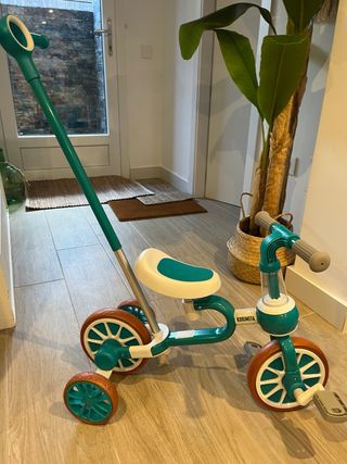 Triciclo infantil de la marca KORIMEFA, ideal para los más pequeños. Su diseño es moderno y llamativo. - Color verde azulado y blanco. - Asiento cómodo. - Ruedas con detalles en naranja. - Empuñadura para padres. - Se regula la altura Tiene un pequeño roce que se observa en la fotografia
