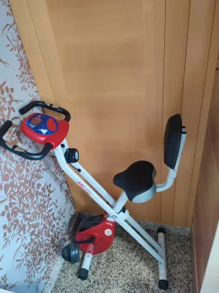 Bicicleta estática de diseño plegable, ideal para mantener la forma en casa. - Estructura de color blanco y rojo. - Asiento acolchado. - Manillar con agarres ergonómicos. -Pantalla digital. - Pedales con correas de sujeción. HOMCOM Bicicleta Estática para Ejercicios Profesional Bicicleta Vertical Plegable de Forma X con 8 Niveles Resistencia Magnética Asiento con Altura Ajustable Acero 43x97x109 cm Rojo