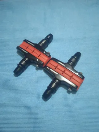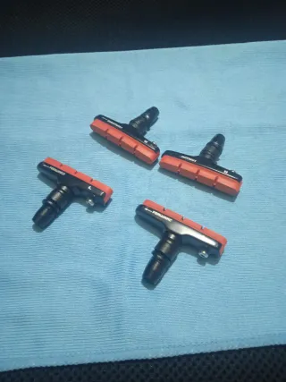 Par de zapatas de freno para bicicleta tipo V-Brake. Son de color rojo y negro. - Incluye dos unidades. - Diseño con flechas indicando la dirección FORWARD. - Marcadas con L y R para izquierda y derecha. Hago envíos por Wallapop.