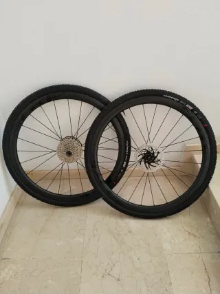 vendo ruedas de gravel aun con los pelos,no llegara a 10 salidas lo q tienen,solo las cubiertas costaron 80 euros estan tuberilizadas,piñonera y disco con el mismas salidas q las cubiertas y tambien daria funda q caben 2 ruedas de cualquier medida enteras,la broma de todo el conjunto ronda los 300 euros yo en 190 lo vendo.