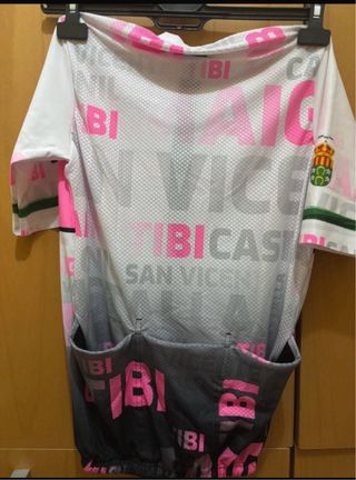 Maillot de ciclismo de la marca SP, talla M. Diseño moderno y llamativo. - Color blanco con detalles en rosa y verde. - Cierre completo con cremallera. - Tejido técnico transpirable.