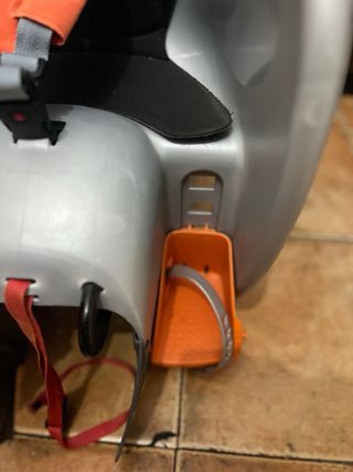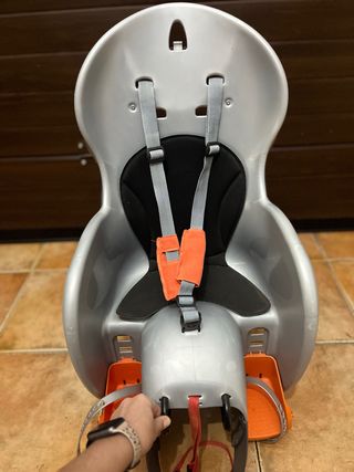 Silla de seguridad para bicicleta marca Btwin, diseñada para niños. - Asiento ergonómico. - Arnés de seguridad de 3 puntos. - Reposapiés ajustables. - Diseño en color gris y naranja.