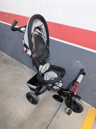 Triciclo evolutivo con diseño moderno y funcional. - Asiento acolchado y reversible. - Barra de seguridad. - Reposapiés. - Cesta de almacenamiento. - Capota. - Empuñadura para padres.