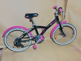 Bicicleta infantil BTWIN en color rosa y negro, ideal para las pequeñas ciclistas. - Cuadro de acero. - Ruedas de 20 pulgadas. - Frenos V-brake. - Sillín ajustable. - Guardabarros delantero y trasero.